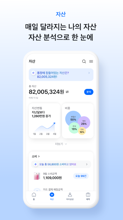 A. 가장 큰 장점은 통합 관리 기능입니다. 여러 앱을 따로 사용할 필요 없이 하나의 플랫폼에서 금융 활동을 처리할 수 있어 편리합니다. 또한 개인 맞춤형 정보 제공과 리워드 시스템이 결합되어 실용성과 재미를 동시에 제공합니다.