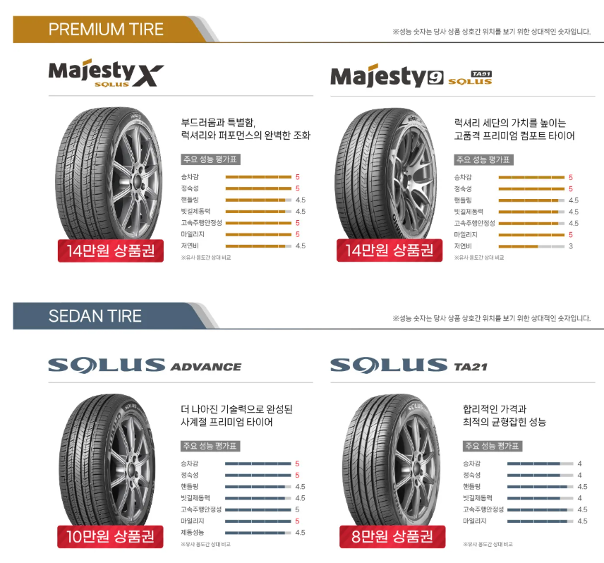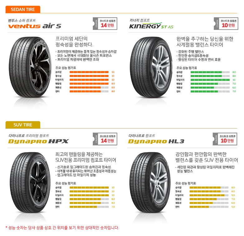 | 한국타이어 | 정숙성 중심 | 세단, SUV |