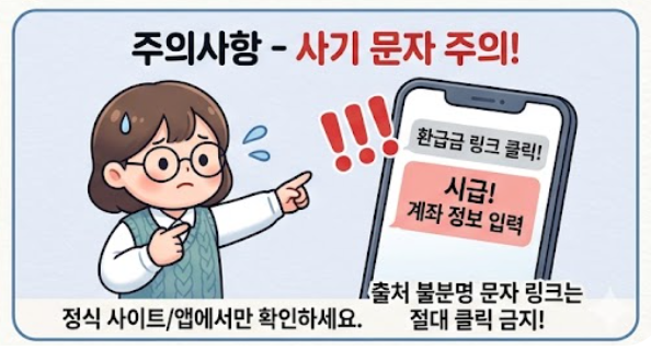조회 과정에서 가장 주의해야 할 부분은 피싱 문자입니다. 공식 경로가 아닌 링크를 통해 접속하는 경우 개인정보 유출 위험이 존재합니다. 문자 링크는 절대 클릭하지 않는 것이 원칙입니다. 반드시 공식 사이트나 앱을 통해서만 확인해야 안전합니다. 정상적인 환급 절차에서는 별도의 외부 링크 입력을 요구하지 않습니다. 이러한 기본 원칙만 지켜도 대부분의 피해를 예방할 수 있습니다.