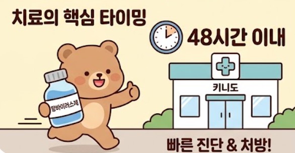 A. 증상 발생 후 48시간 이내에 치료를 시작하는 것이 가장 효과적이다. 이 시기를 놓치면 항바이러스제 효과가 감소할 수 있으며 회복이 지연될 수 있다. 따라서 의심 증상이 나타나면 빠르게 진료를 받는 것이 중요하다.