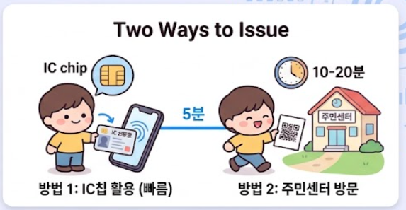 발급은 IC 방식과 방문 방식 두 가지로 나뉩니다. IC 칩이 내장된 신분증이 있다면 NFC 기능을 통해 즉시 등록이 가능하며, 별도 방문 없이 진행됩니다. 반면 일반 신분증은 주민센터 또는 경찰서를 통해 QR 발급을 받아야 합니다. IC 방식은 가장 빠르고 간편한 절차입니다. 방문 방식은 안정적이지만 시간이 더 소요됩니다. 본인의 상황에 맞춰 선택하면 효율적인 진행이 가능합니다.