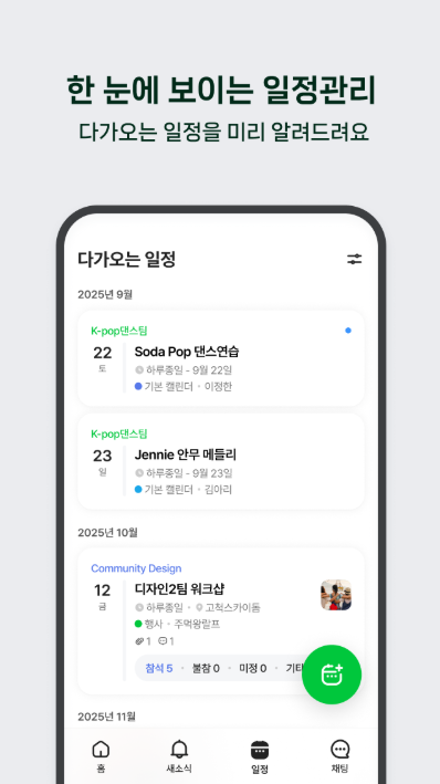 A. 일정 관리 기능을 이용하면 그룹 캘린더에 모임 일정이나 행사 일정을 등록할 수 있습니다. 등록된 일정은 모든 구성원에게 공유되며 알림 기능을 통해 일정이 다가올 때 안내를 받을 수 있습니다. 이를 통해 모임 참여율을 높이고 중요한 약속을 놓치는 상황을 줄일 수 있습니다.