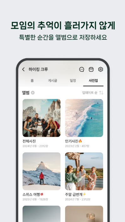 BAND에서는 모임에서 촬영한 사진과 영상을 업로드하여 공동 앨범으로 관리할 수 있습니다. 여행, 행사, 모임 활동 등 다양한 순간을 기록하여 구성원들과 함께 공유할 수 있으며 주제별로 앨범을 정리하면 필요한 자료를 쉽게 찾을 수 있습니다. 특별한 순간을 기록하고 언제든 다시 확인할 수 있다는 점은 커뮤니티 활동의 만족도를 높입니다. 또한 앨범 구조를 활용하면 많은 사진이 쌓여도 체계적으로 관리할 수 있습니다. 모임의 추억을 장기적으로 보관하는 기능은 커뮤니티 유지에 중요한 요소입니다. 시간이 지나도 게시된 사진과 영상을 다시 확인하며 모임의 기록을 공유할 수 있습니다.