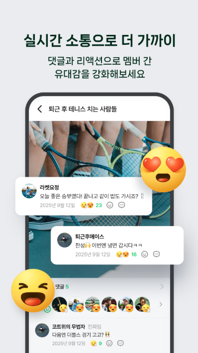 BAND에서는 게시글 댓글, 리액션, 라이브 기능을 통해 구성원 간 실시간 소통이 가능합니다. 게시글에 댓글을 남기거나 다양한 반응을 표현하며 자연스럽게 커뮤니티 참여를 이어갈 수 있습니다. 온라인 공간에서도 구성원 간 유대감을 형성할 수 있는 점이 중요한 특징입니다. 라이브 기능을 활용하면 같은 공간에 있지 않아도 실시간으로 소통하며 활동을 공유할 수 있습니다. 실시간 커뮤니케이션은 커뮤니티 활성화에 중요한 역할을 합니다. 댓글과 반응 기능을 통해 구성원 간 자연스러운 교류가 이루어집니다.