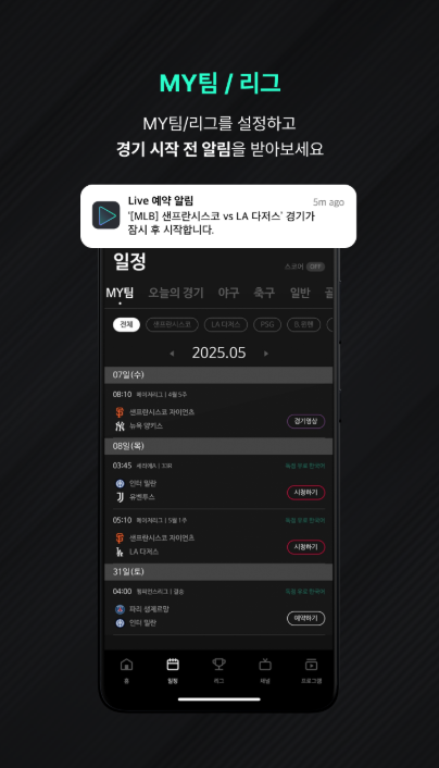 스코어 On-Off 기능은 경기 결과 노출을 제어할 수 있어 사용자 선택권을 강화합니다. 결과를 숨기고 시청하는 기능은 몰입감을 유지합니다. 또한 알림 설정을 통해 중요한 경기 시작을 놓치지 않을 수 있습니다. 정보 노출을 조절하는 기능은 사용자 경험을 세밀하게 개선합니다. 이러한 옵션은 다양한 시청 스타일을 만족시키는 핵심 요소입니다.