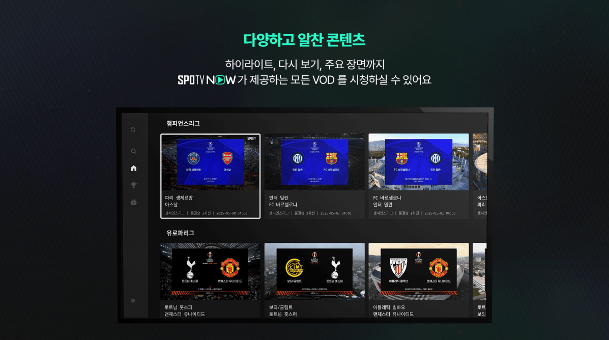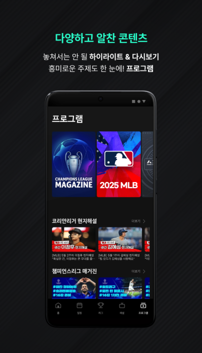 축구, 야구, 격투기 등 다양한 종목을 한 플랫폼에서 제공하는 것이 핵심 경쟁력입니다. 챔피언스리그, 유로파리그, 세리에A 같은 인기 리그부터 MLB와 고교야구, 격투 스포츠까지 폭넓은 구성이 특징입니다. 다양한 종목을 한 번에 시청할 수 있다는 점이 가장 큰 장점입니다. 또한 사용자는 관심 있는 리그를 중심으로 콘텐츠를 선택할 수 있습니다. 한 플랫폼에서 여러 스포츠를 통합 제공한다는 점이 매우 효율적입니다. 이러한 구성은 스포츠 팬의 만족도를 크게 높이는 핵심 요소로 작용합니다.