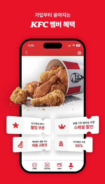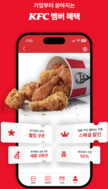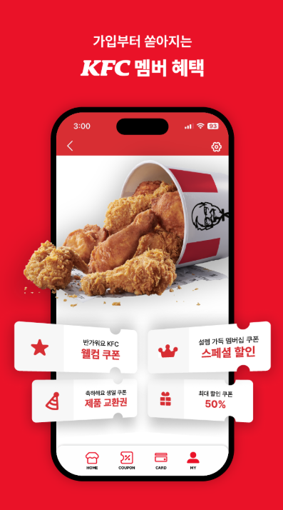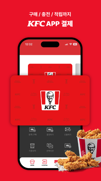KFC 앱은 멤버십, 쿠폰, 결제, 선불카드 기능을 하나로 통합해 효율적인 소비 경험을 제공합니다. 반복 주문 시 누적되는 혜택이 특징입니다.