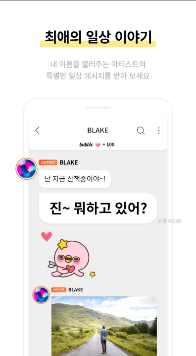 bubble for YH의 가장 큰 특징은 아티스트와 1:1처럼 느껴지는 메시지 경험입니다. 단순한 공지 전달이 아니라 개인화된 메시지 형태로 전달되어 몰입감을 높입니다. 최애의 일상을 직접 받는 듯한 경험이 핵심입니다. 또한 사용자 이름이 반영된 메시지 구조를 통해 더욱 친밀한 소통이 가능합니다. 이러한 구조는 팬 경험의 질을 크게 향상시키는 요소입니다. 다양한 콘텐츠와 함께 메시지가 전달되기 때문에 단순 텍스트 이상의 가치를 제공합니다.